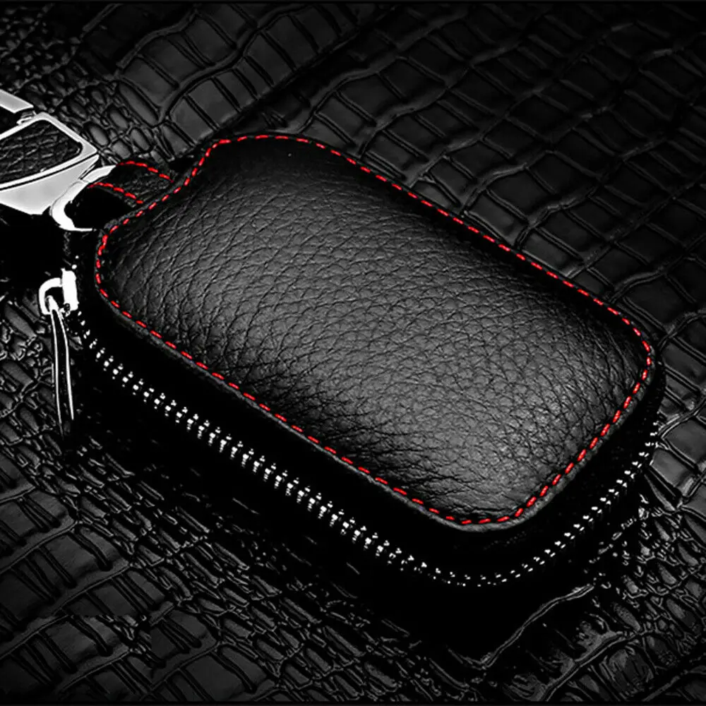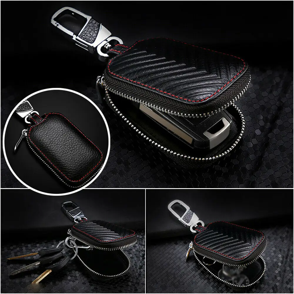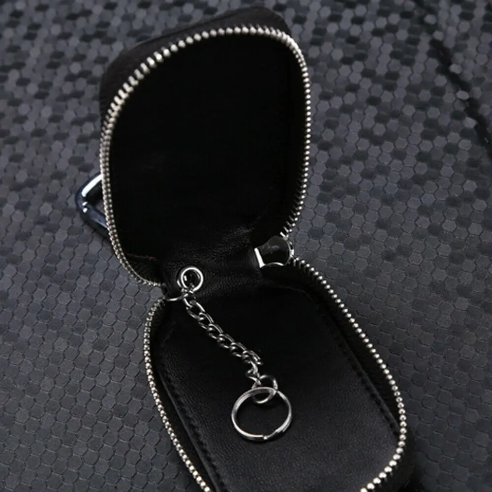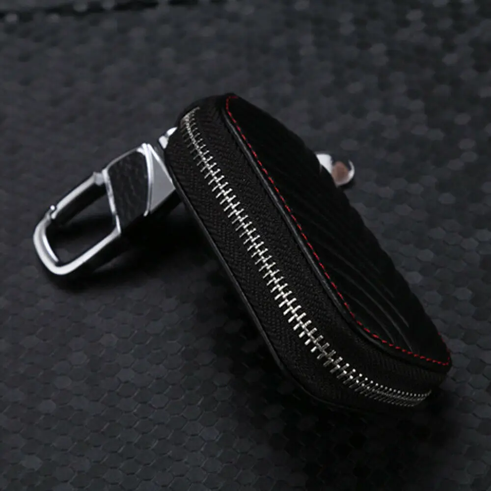 | Black Key Holder Cover Car Key Chain Bag Genuine Leather Remote Fob Zipper Case Useful Car Interior Accessories |